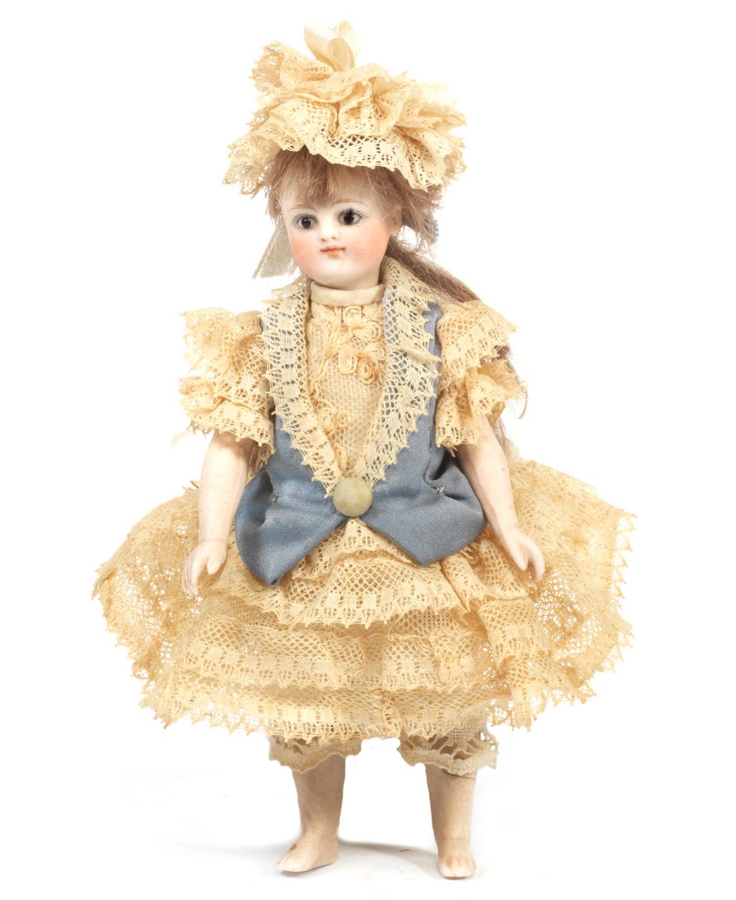 Beautiful pale bisque head with fixed brown glass eyes, finely painted eye lashes and brows, closed mouth and long brown wig, swivel head to bisque body, jointed at shoulders and hips, wearing a lace dress with blue silk jacket and bonnet, (left leg broken and re-glued, loose), 15cm (6in) tall. Sold for £675 at Bonhams