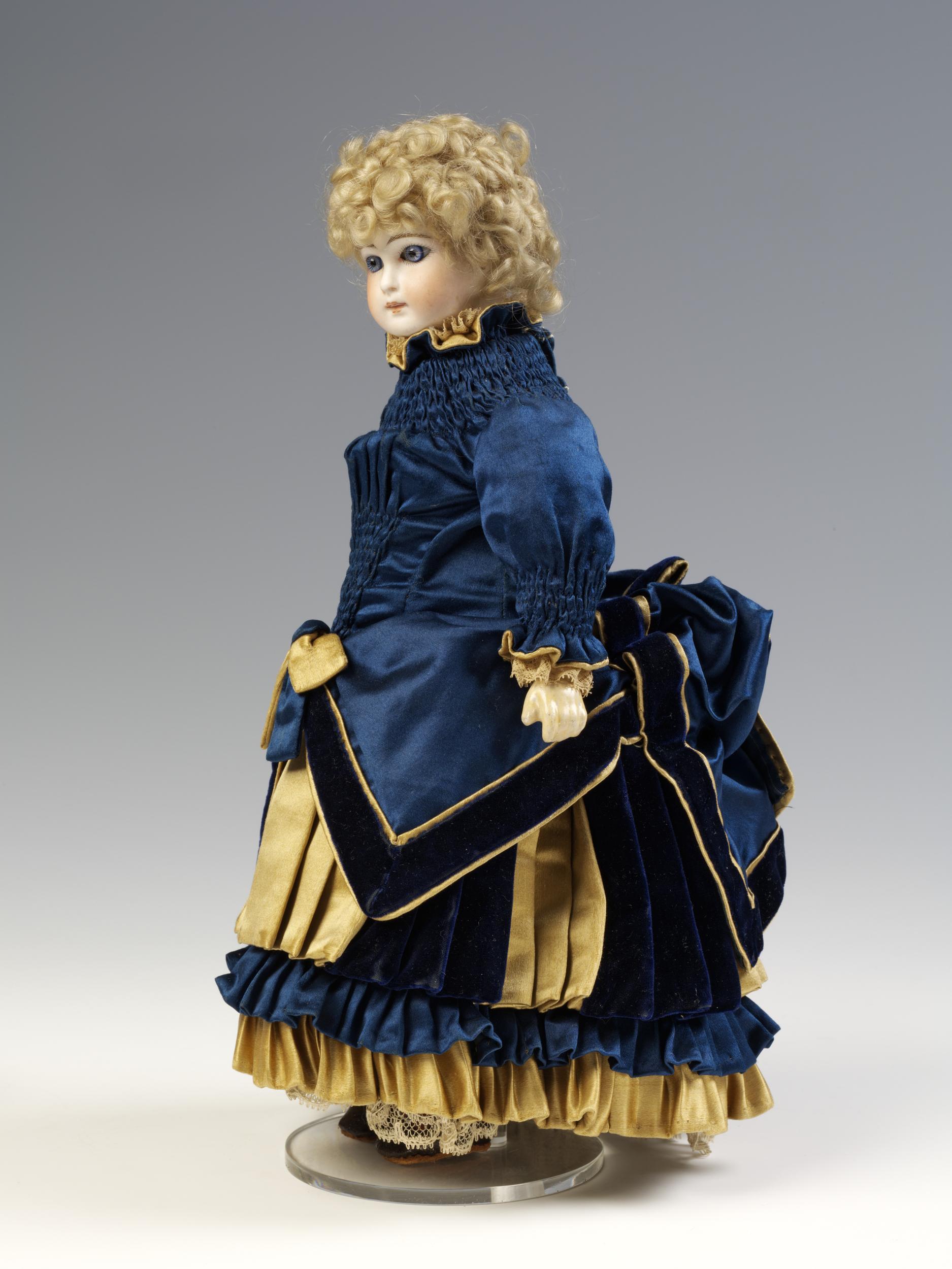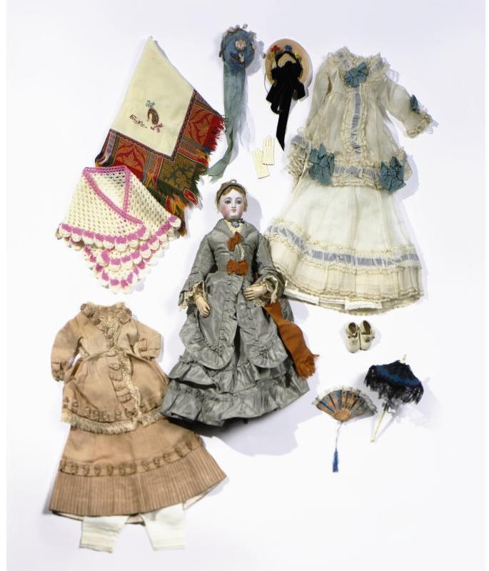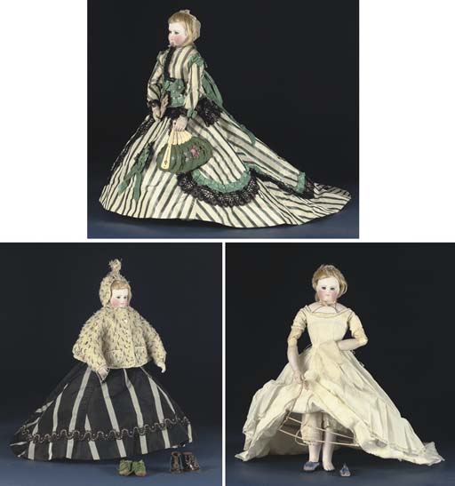 with rigid neck, unpierced ears, closed mouth, sleeping eye mechanism, pale brows and lashes, original blonde mohair wig with cork pate and kid over wood jointed body with bisque arms and legs –17½in. (45cm.) high (left thumb missing, eye mechanism possibly an addition), wearing boned stays edged in blue, rare hoop with train and front lifting band, matching petticoat with deep gathered hem flounce edged with lace, socks, pantalettes and elaborate cream, grey and green striped silk afternoon frock with full train, the jacket, skirt and belt decorated with black lace, green silk ribbons and white glass beads, with matching kid slippers; additional clothes comprise another striped silk day dress in grey and black, the jacket and full skirt decorated with black ribbons, lace, an elaborate braid and black and white glass beads; a similar shaped full length petticoat edged with lace; a white plush jacket simulating ermine with capelet decorated with a silk tassle and silk edged pockets, a lace cap, a red silk snood, an initialled handkerchief, a pair of kid gloves, two and a half pairs of stockings, a pair of mauve and blue silk slippers with gilt buckles and blue ribbon binding (heels missing); a pair of heeled lace-up boots (one heel missing), a pierced bone brisé fan simulating a Chinese feather fan, the scalloped green fabric ‘feather’ painted with blue and pink flowers; and a home-made fine pink and cream checked silk gauze evening dress, the jacket and skirt edged with turquoise silk ribbons with similar rosettes and lace edging (needs attention). Sold for GBP 5,040 at Christies