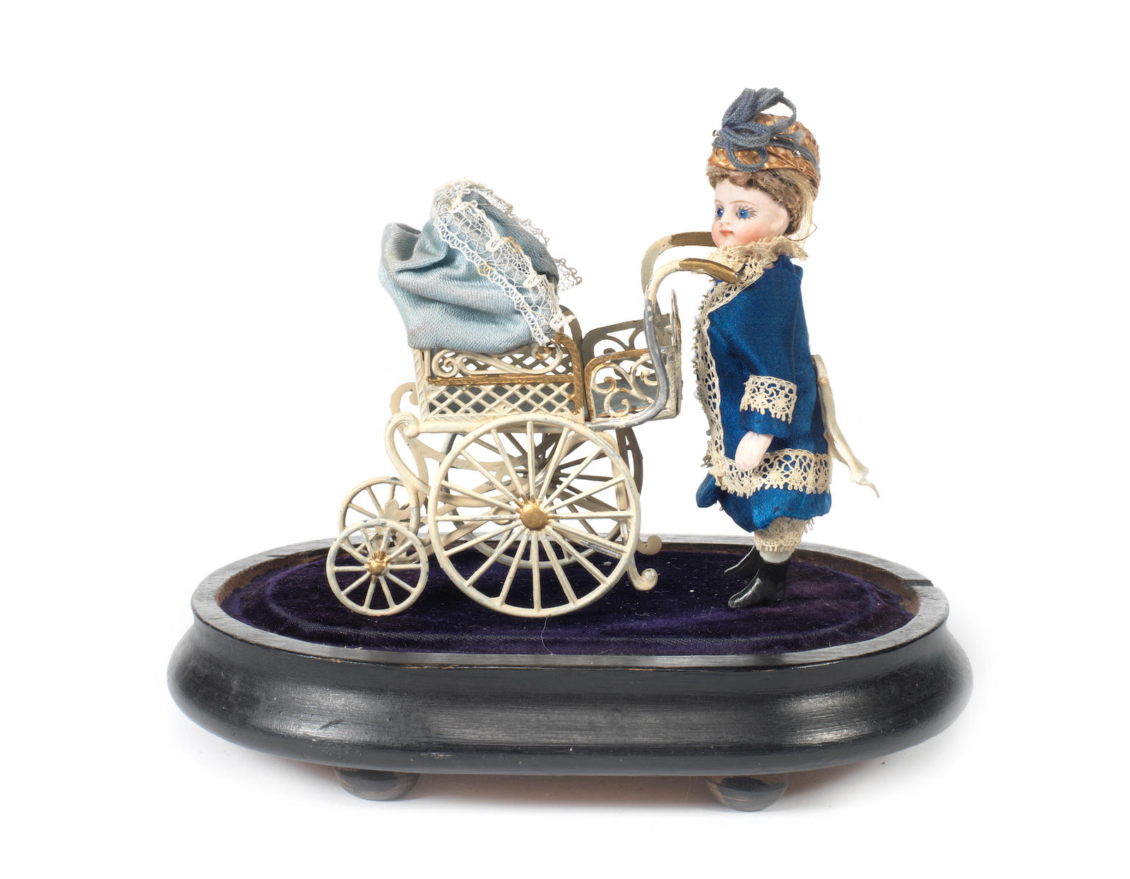 With fixed blue glass eyes, closed mouth and blonde wig, swivel head and jointed at shoulders and hips, painted black heeled boots and wearing blue silk dress with lace, underclothes and straw bonnet, 10cm (4in) tall, together with soft metal filigree white and gold pram with blue hood. dome 19cm (7 1/2in) tall. Sold for £625 at Bonhams