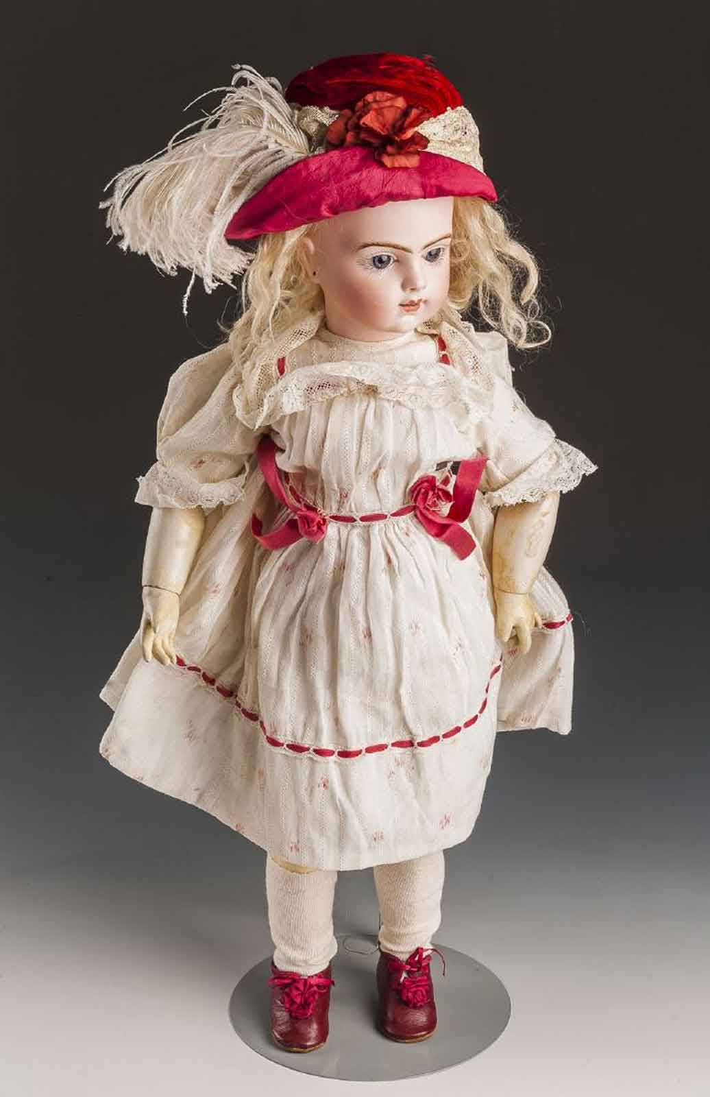 Bru JNE R bisque head Bebe doll. France circa 1890. Pressed bisque socket head incised “BRU JNE R 9.” Blue glass eyes with multi stroke brows and lashes. Open mouth with molded upper teeth. Pierced ears. Jointed composition body with mama voice box. Blonde mohair wig with cork pate. In later white dress with red trim, red hat and shoes. MEASUREMENTS: 22″ tall. CONDITION: Small rub to right cheek. Wig is detached. Two repaired fingers to left hand. Toning to paint on body. Sold For: $1,900 at Cordier Auctions & Appraisals