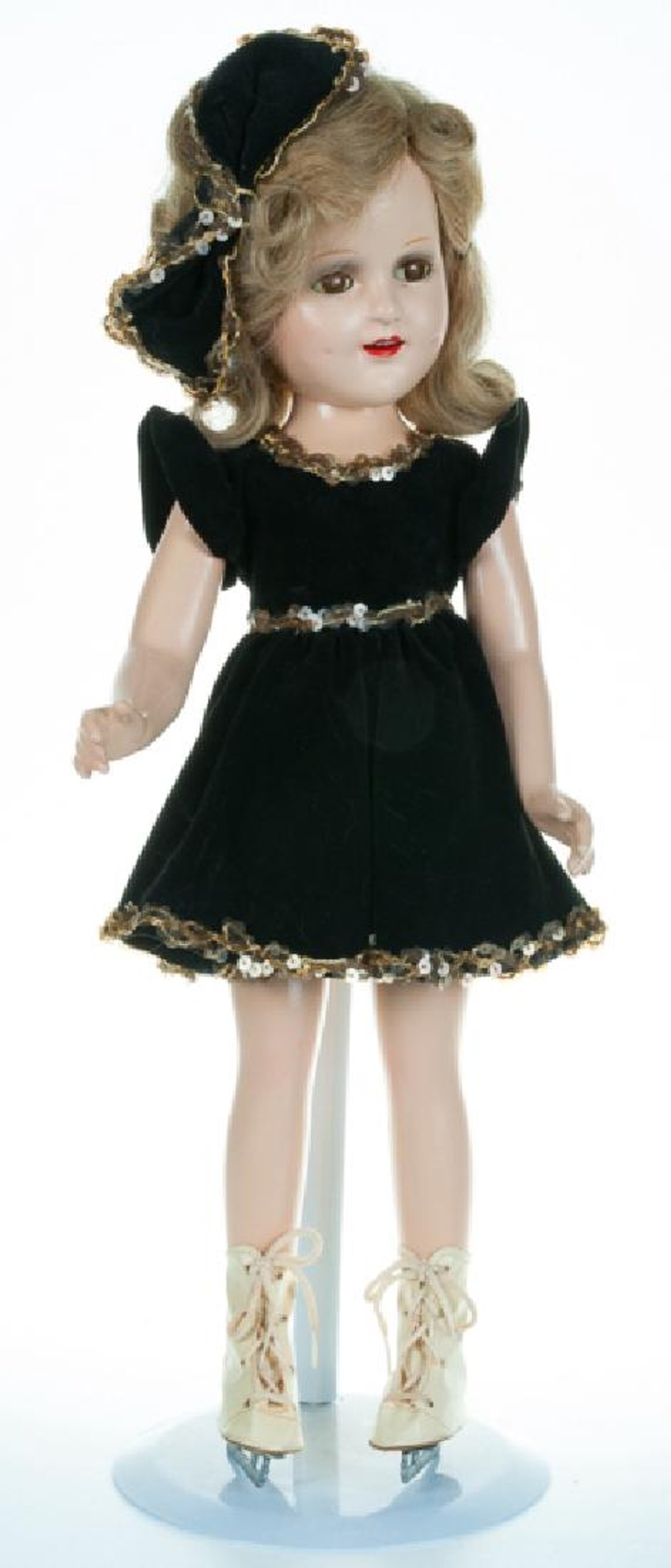 Sonja Henie Madame Alexander composition doll with open mouth and closing eyelids; measures approximately 18-1/2″ high. Labeled to dress. Doll with stand. Clothes are clean. Sold for $100 at Bremo Auctions