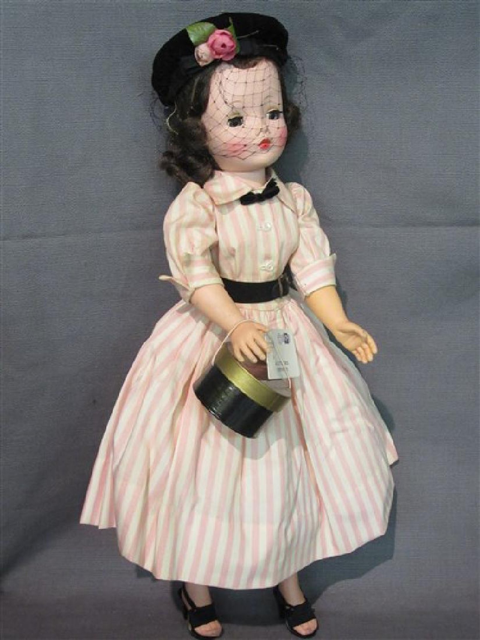 A 1950’s Madame Alexander Cissy Doll. Always stored in box. Original hat with face net, shoes, pink and white striped dress, stockings, hat box and tag. Original box.Dimensions: 20″ height.