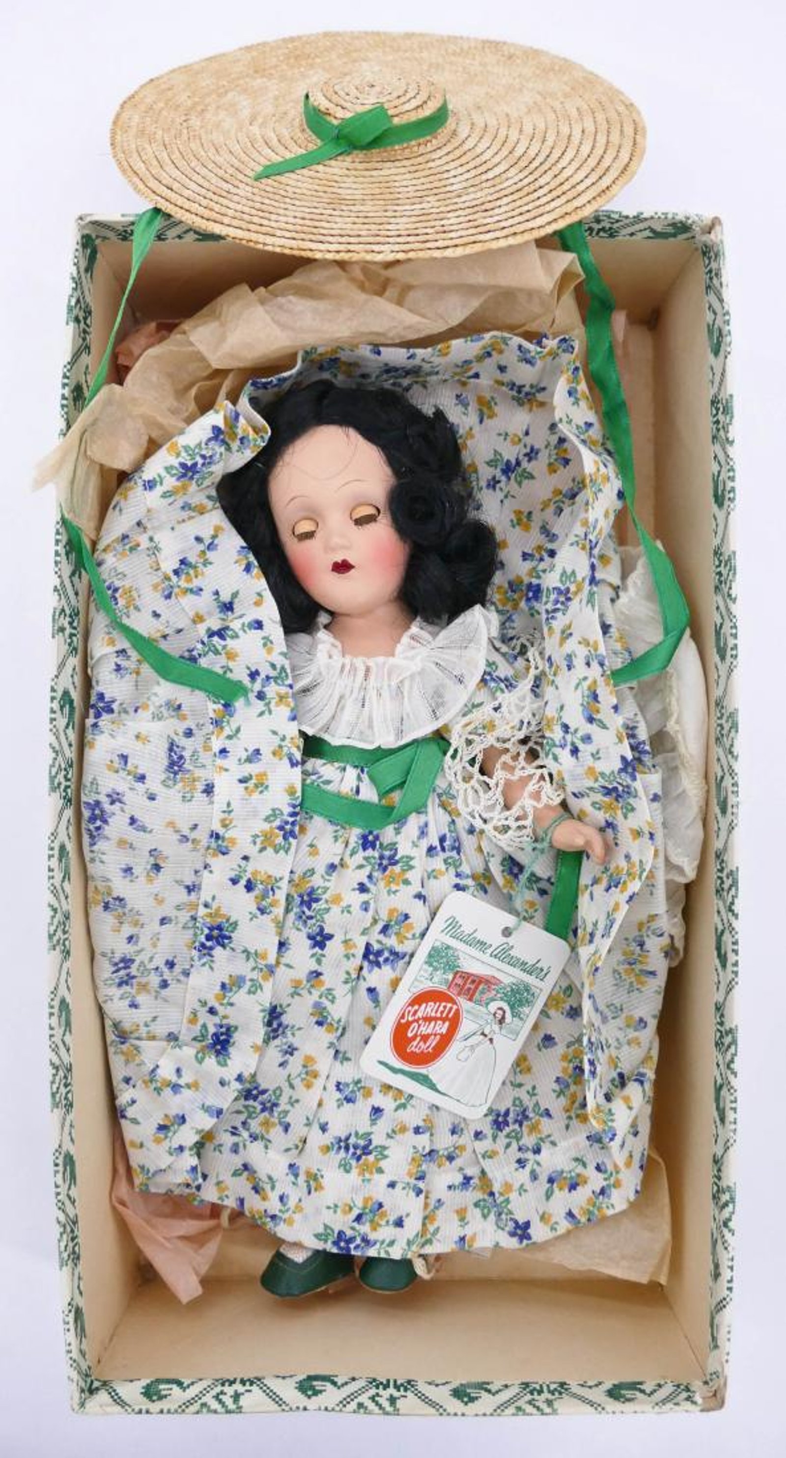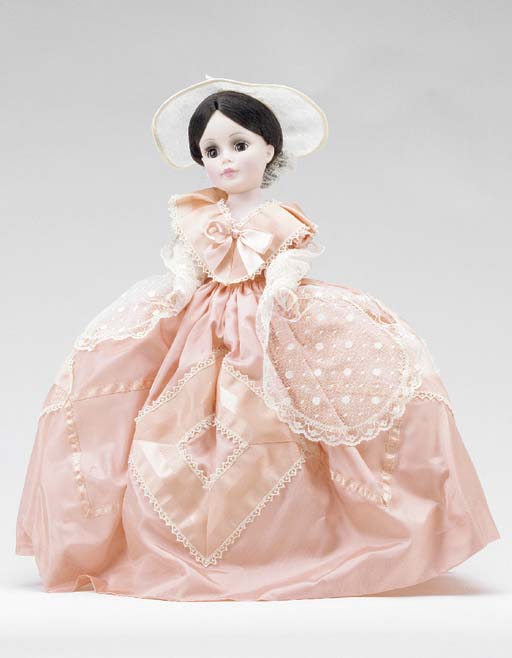 A Madame Alexander doll depicting Melanie created circa the 1960s to correspond with one of the theatrical re-releases of “GWTW.” Made of plastic materials with ‘sleep eyes,’ a partially hand-painted face and moveable limbs, this doll has straight, black hair and she wears her vintage clothing including a peach-colored taffeta dress with lace trim and a matching hat. Her original box is also included.