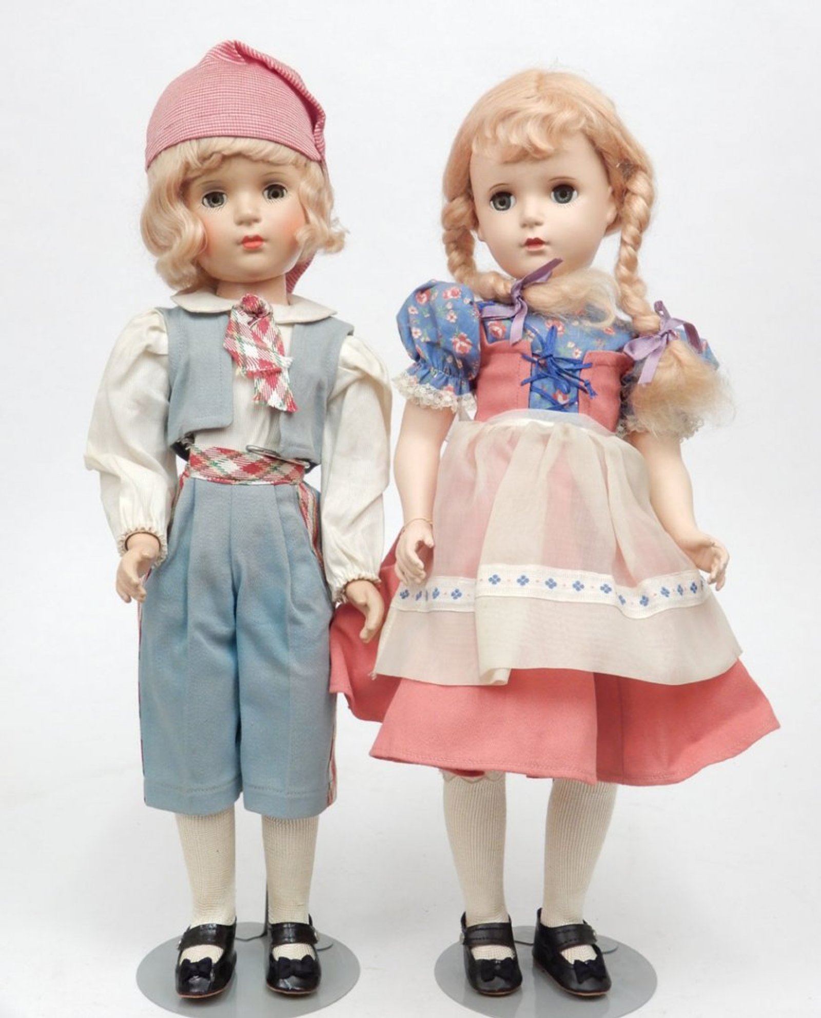Madame Alexander Dolls, Madame Alexander Hansel & Gretel, Hansel is composition, Gretel is hard plastic, marked Alexander on back of heads, wearing tagged outfits, 18″ tall. Sold For: $1,300 at Stephenson’s Auction