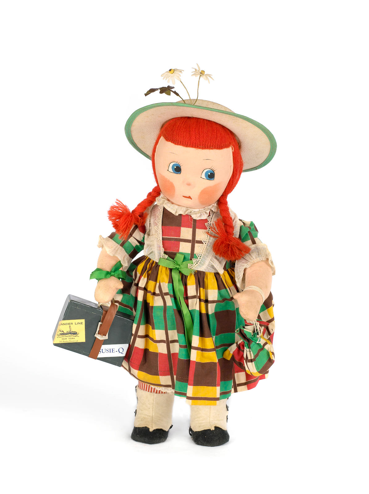 With large painted blue side glancing eyes, rosie cheeks and red wool plaited hair, swivel head and wearing original brightly patterned dress, with bag, felt shoes, straw boater with daisies, and holding her travel case, in her blue card box with lid, and label, 38cm (15in) tall. Sold for £125 at Bonhams